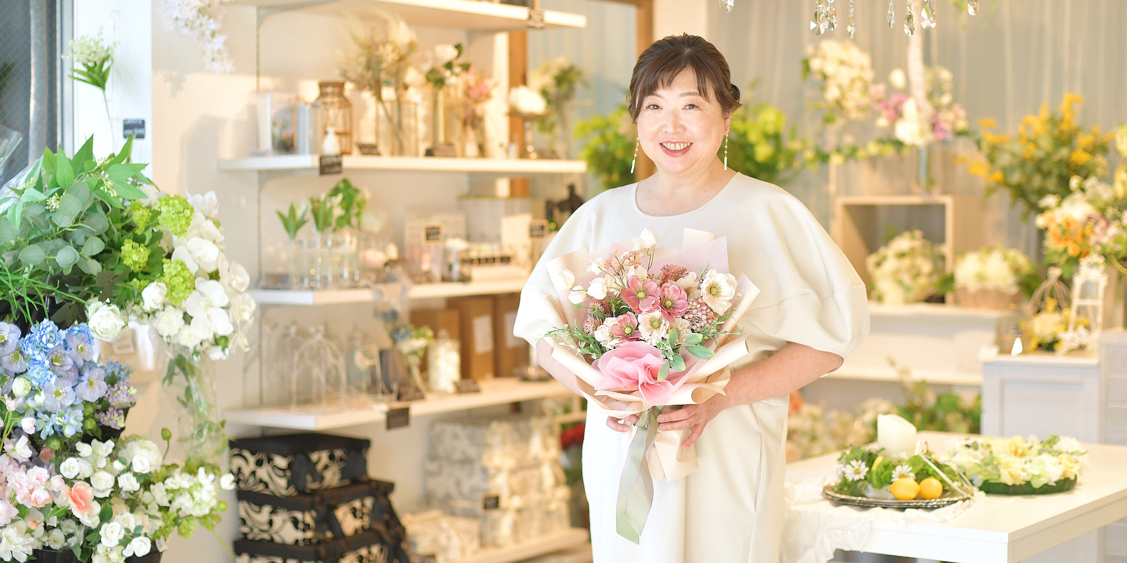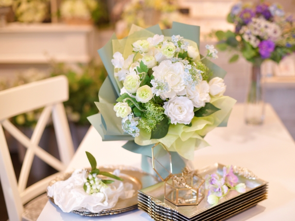コロナ禍以降、家にいる時間が長くなったという方が多いのではないでしょうか。おうち時間を楽しむ際、インテリアに自然と溶け込むようなお花があると、心が落ち着くのではないかと思います。当店の作品は、カラフルすぎる色合いにしたり、派手に飾り立てることはしません。「お花が好きな大人の女性」へ、日常を豊かにする、上質で洗練された作品を提供することが、当店の持ち味だと思っています。 また、私はアーティフィシャルフラワーとリボンの両方を手掛けていますから、お花とリボンを組み合わせた作品を楽しんでいただける点も当店の特徴です。