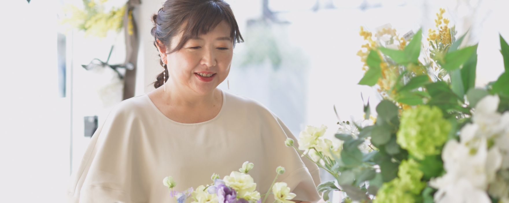 布素材で生花をリアルに再現し、成果にはない美しさを表現した造花「アーティフィシャルフラワー」(シルクフラワー)を使い、ブーケやリースを作ったり、花器などに飾り付けたりするのがアーティフィシャルフラワーアレンジメントです。『M FLORA(エムフローラ)』では、私が手掛けたブーケなどの作品はもちろん、単品のアーティフィシャルフラワーや花器、アーティフィシャルフラワーと一緒に香りを楽しむためのアロマオイル、その他にキャンドルやジュエリーといった雑貨類も扱っています。また私は、リボンのライセンスを取得しており、店内でフラワーアレンジメントやリボン作りのレッスンも行っています。