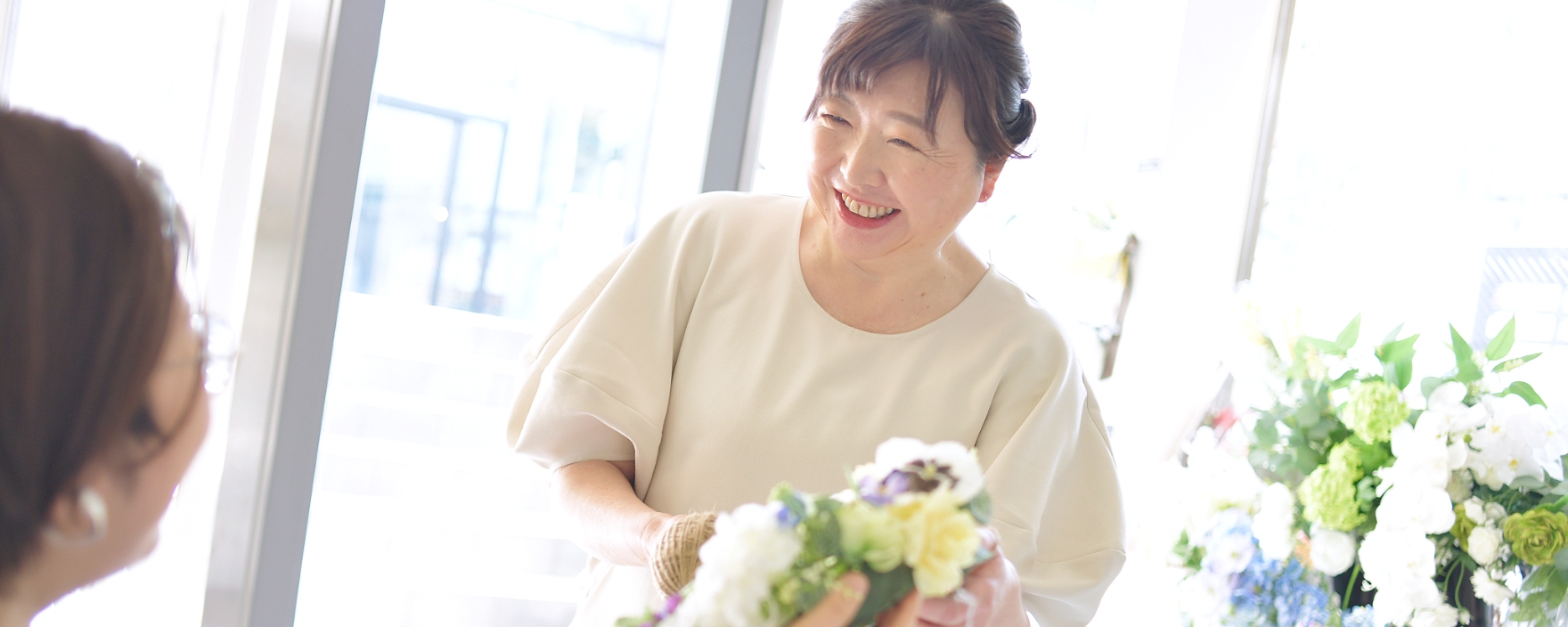 コロナ禍以降、家にいる時間が長くなったという方が多いのではないでしょうか。おうち時間を楽しむ際、インテリアに自然と溶け込むようなお花があると、心が落ち着くのではないかと思います。当店の作品は、カラフルすぎる色合いにしたり、派手に飾り立てることはしません。「お花が好きな大人の女性」へ、日常を豊かにする、上質で洗練された作品を提供することが、当店の持ち味だと思っています。 また、私はアーティフィシャルフラワーとリボンの両方を手掛けていますから、お花とリボンを組み合わせた作品を楽しんでいただける点も当店の特徴です。